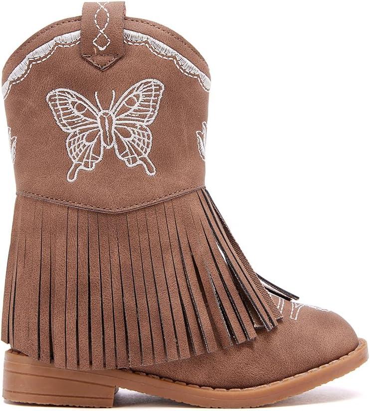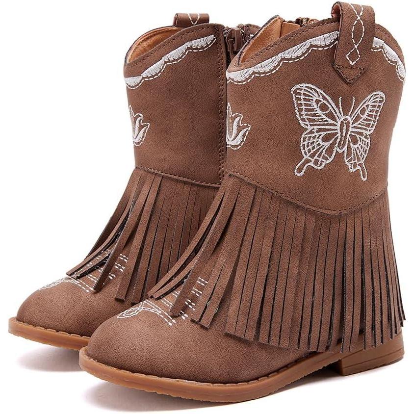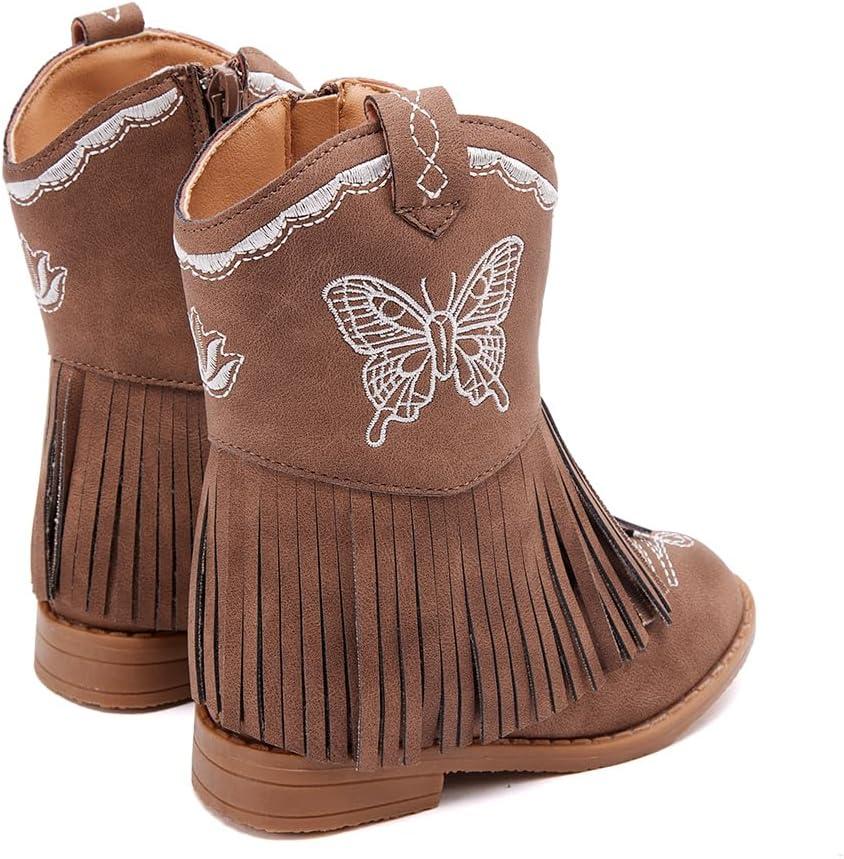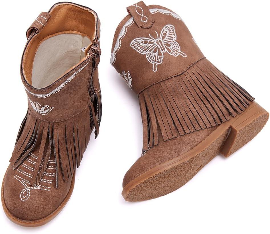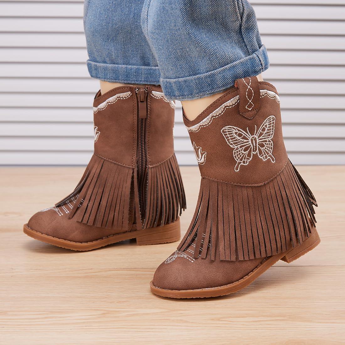BMCiTYBM Toddler Girls Cowgirl Boots Little Kids Mid Calf Western Cowboy Pointed Toe Riding Shoes Tassels Glitter(3-brown)