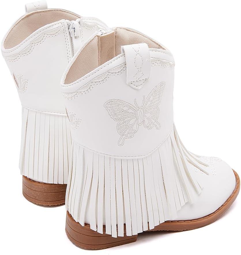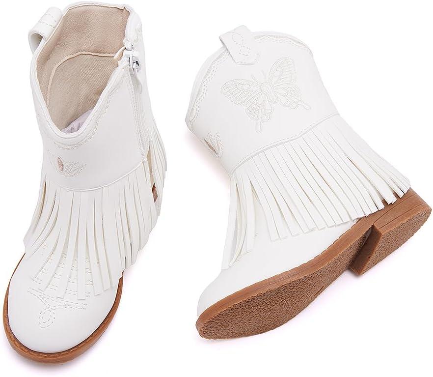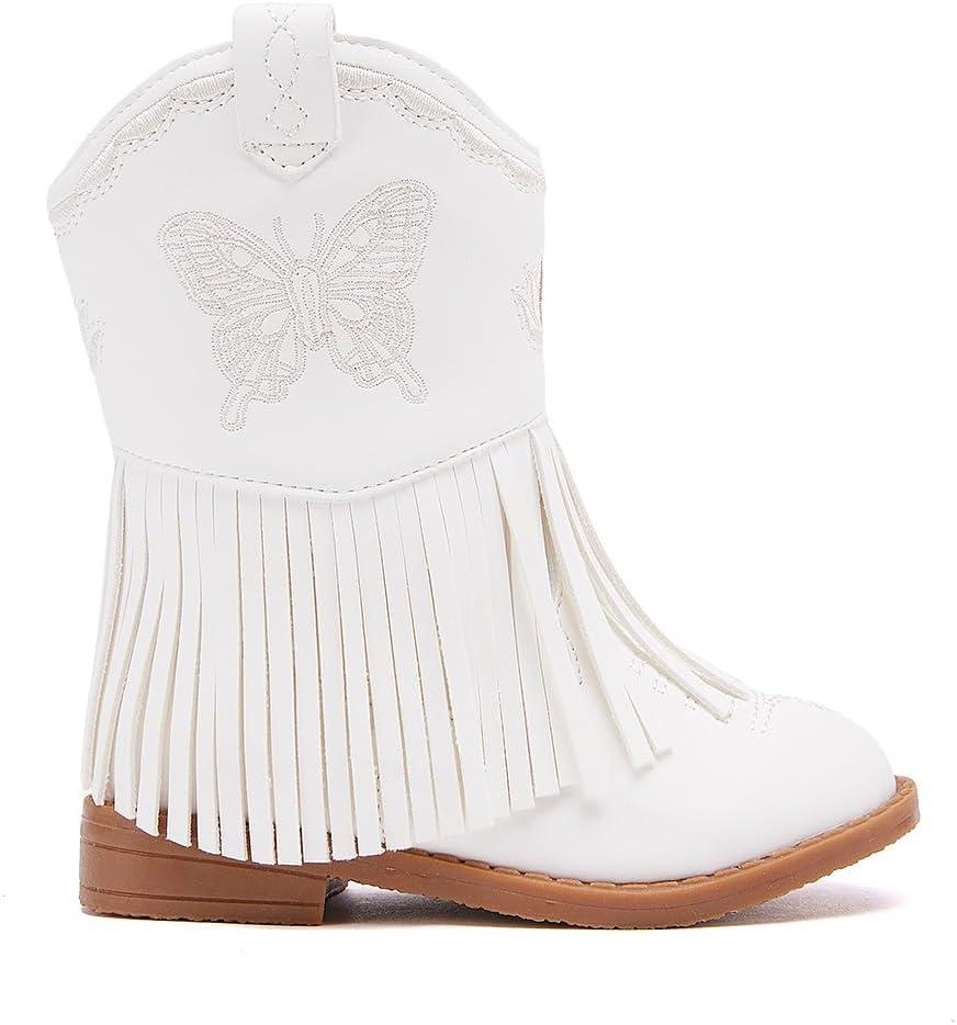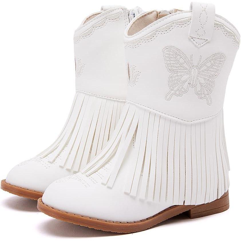 BMCiTYBM Toddler Girls Cowgirl Boots Little Kids Mid Calf Western Cowboy Pointed Toe Riding Shoes Tassels Glitter(3-white)